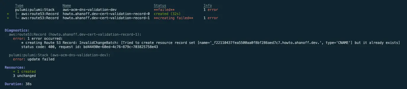 * creating Route 53 Record: InvalidChangeBatch: [Tried to create resource record set [name='_f22110437fea5500aa0f8bf286aed7c7.howto.ahanoff.dev.', type='CNAME'] but it already exists]